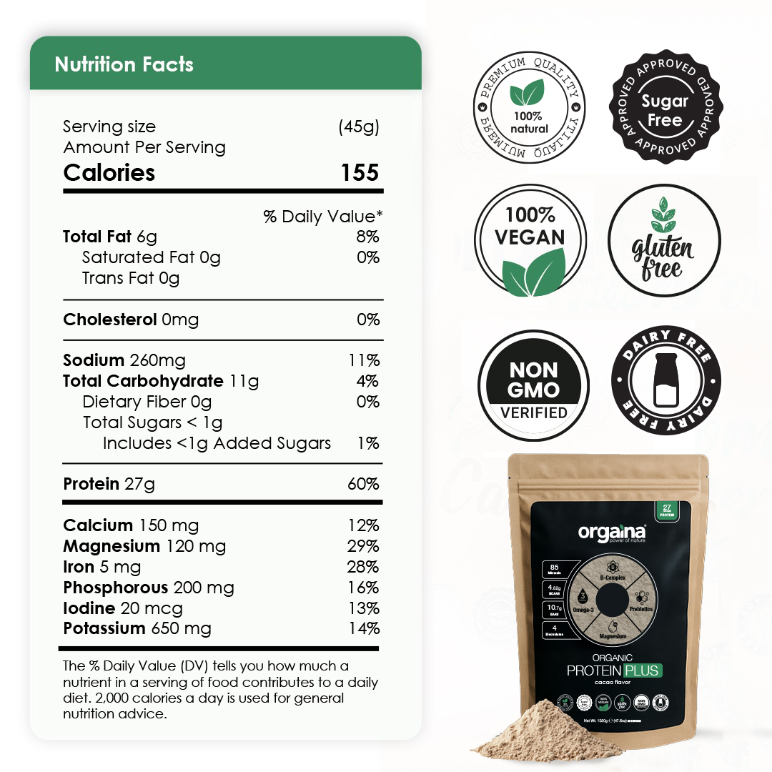 Orgaina Protein Plus is a clean, plant-based fusion of natural protein—enhanced with dark cacao and superfoods for a complete wellness upgrade. This powerhouse blend supports muscle growth, recovery, and daily vitality while nourishing both body and mind—naturally.